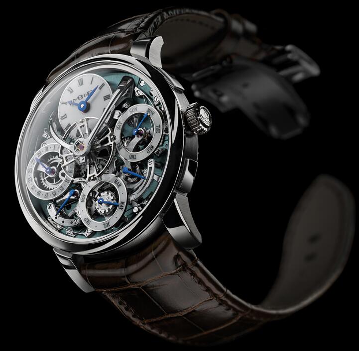 Other details: 581 components. Dial-side complications and mechanical processor system architecture with built-in safety mechanisms. Manual winding with twin barrels. Bespoke 14mm balance wheel with traditional adjustment screws on top of movement. Finishes throughout respect the style of the 19th century; internal bevels; polished bevels; Geneva waves; hand-carved.